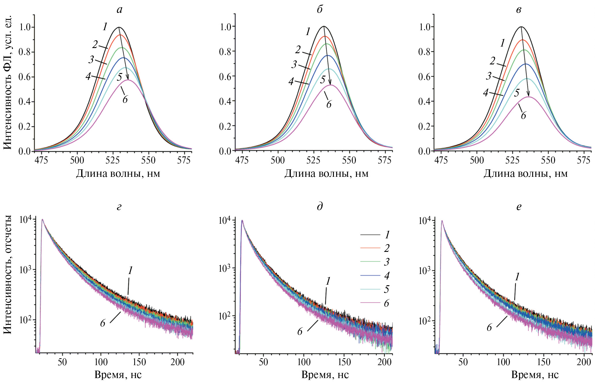 Рис. 3. Влияние температуры на спектры и кривые затухания ФЛ квантовых точек CdSe/ZnS в воде (а, г), в биополимерном композите без (б, д) и с (в, е) акцептором энергии. T = 283 К (1, черные кривые), T = 293 К (2, красные кривые), T = 303 К (3, зеленые кривые), T = 313 К (4, синие кривые), T = 323 К (5, голубые кривые), T = 333 К (6, фиолетовые кривые)