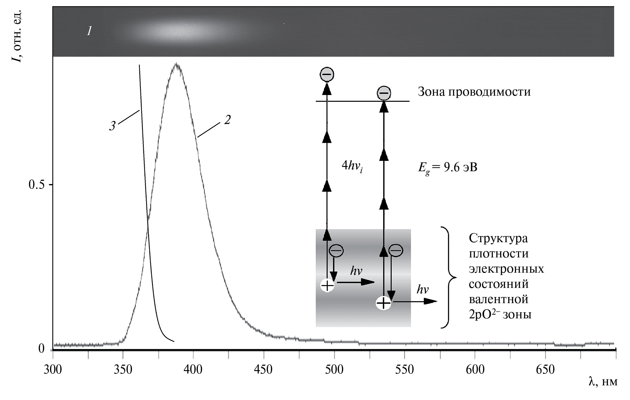 Рис. 3. Спектрограмма (1) и спектр (2) валентной 2pO2– ФЛ особо чистого кристалла Al2O3 при четырехфотонном возбуждении излучением 2ω: Ti: Al2O3 лазера (50 фс; 360 нм; 1.5 ГВт·см–2). Регистрация: задержка 5 нс, экспозиция 10 нс. Спектр четырехфотонного возбуждения 2pO2– ФЛ (3). Слева структура валентной 2pO2– зоны и механизм нелинейного возбуждения 2pO2– валентной ФЛ.