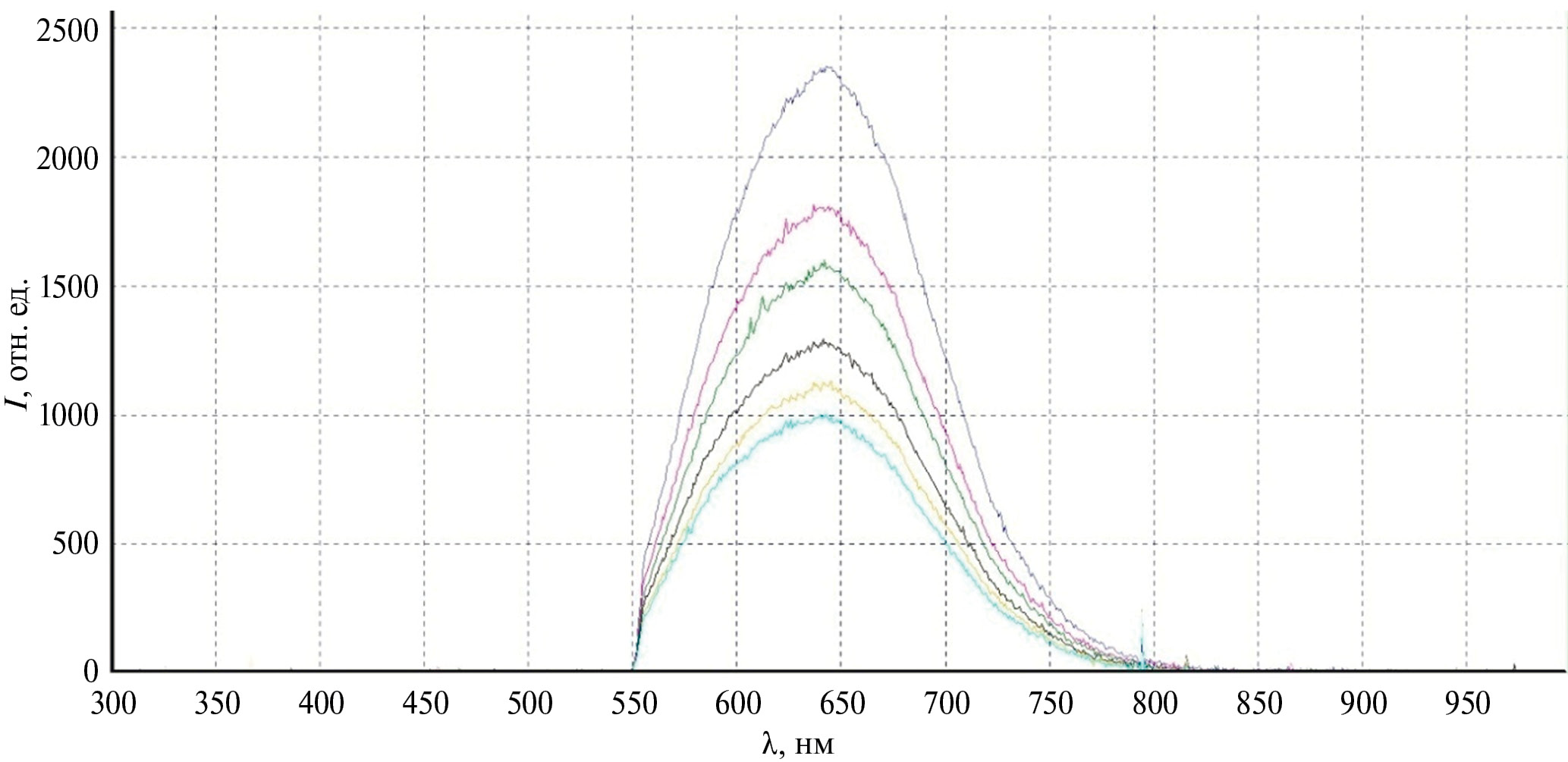 На рис. 1 представлены полученные спектры, измеренные в центре облученной области и при последовательном перемещении от центра к периферии с шагом 100 мкм. Из вида этих спектров следует, что в кристалле образован градиент концентраций центров окраски. Это позволило нам, путем перемещения образца, выбрать области с концентрацией, оптимальной для регистрации одиночных центров.