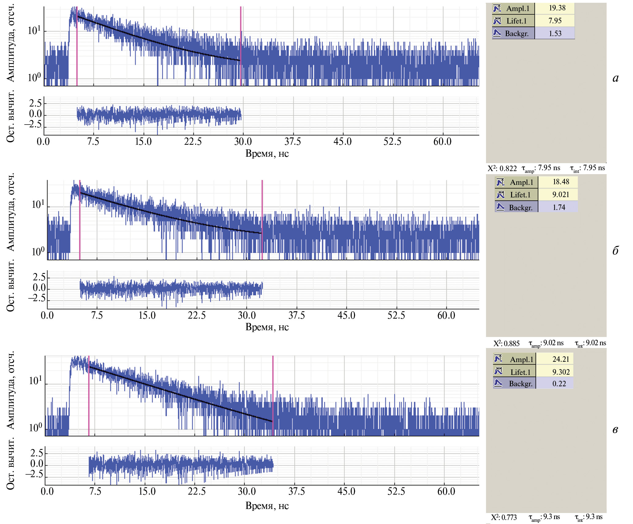 Помимо траекторий интенсивности люминесценции одиночных центров окраски с помощью сканирующего микроскопа MicroTime 200, можно исследовать кинетику люминесценции центров (см. рис. 3). Таким образом, было подсчитано среднее время жизни в возбужденном синглетном состоянии, оно составило 8.12 нс для F3+-центра, 9.39 нс для центра 1 и 9.33 нс для центра 2. Данные значения времени жизни в пределах погрешности измерения совпадают с литературными данными [18].