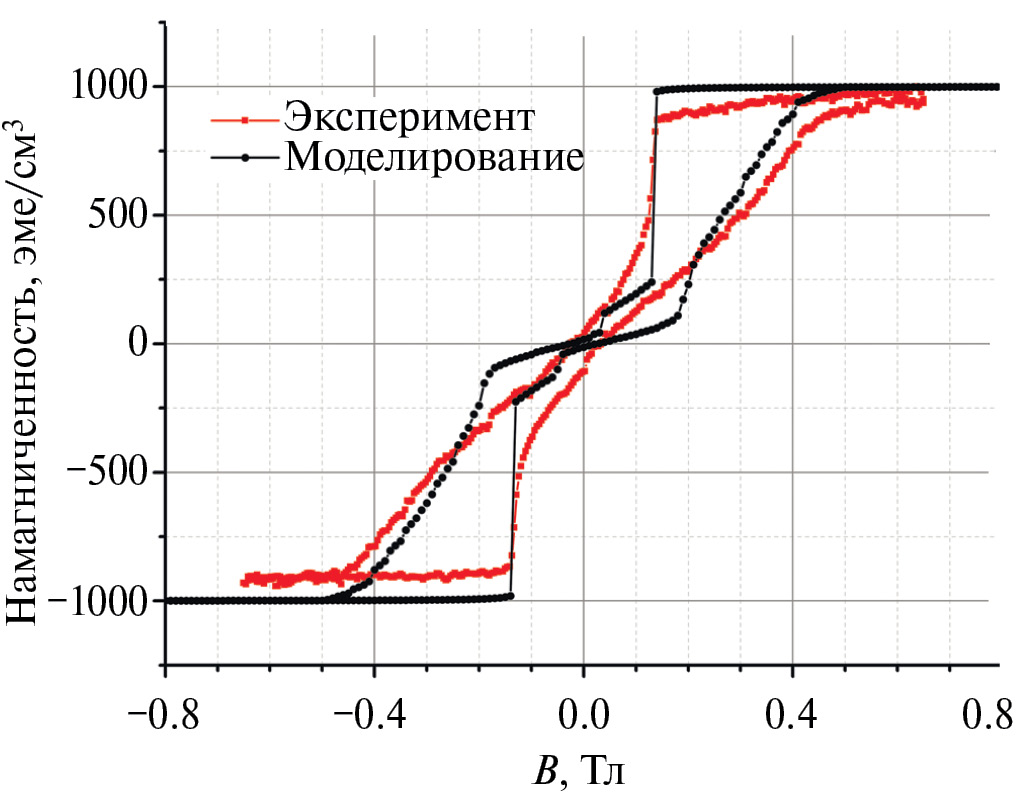 Рассчитанная кривая перемагничивания гетероструктуры как на качественном, так и количественном уровнях неплохо воспроизводит форму измеренной петли гистерезиса при комнатной температуре (рисунок 2). Проявляющиеся различия, вероятно, связаны с модельным приближением T = 0 K.