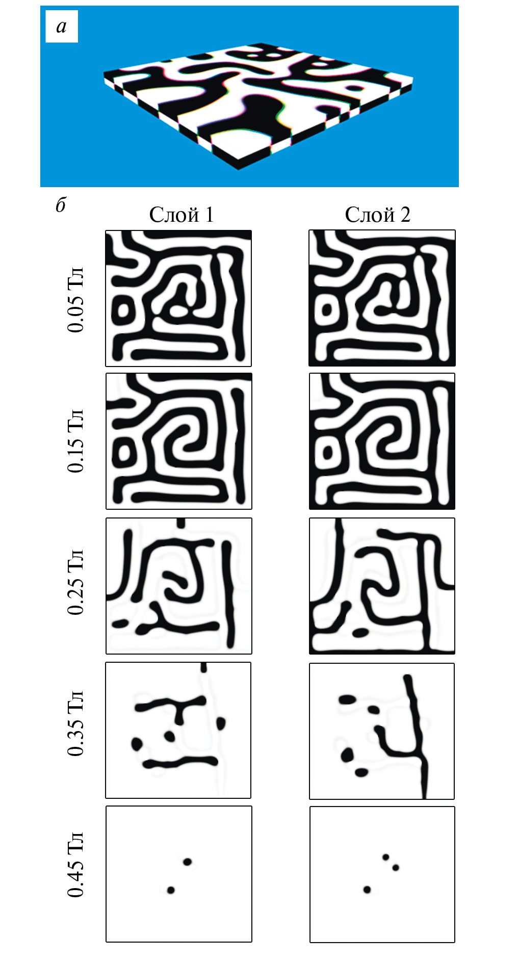 Рис. 4. Равновесная доменная структура тонкопленочной гетероэпитаксиальной структуры FePd/W/FePd в нулевом магнитном поле (а) и ее эволюция в приложенном магнитном поле (б). Два столбца панели (б) иллюстрируют распределение нормальной компоненты намагниченности в середине (по толщине) каждого из двух магнитных слоев; черный и белый цвета соответствуют направлениям намагниченности вниз и вверх вдоль нормали к плоскости образца, соответственно.