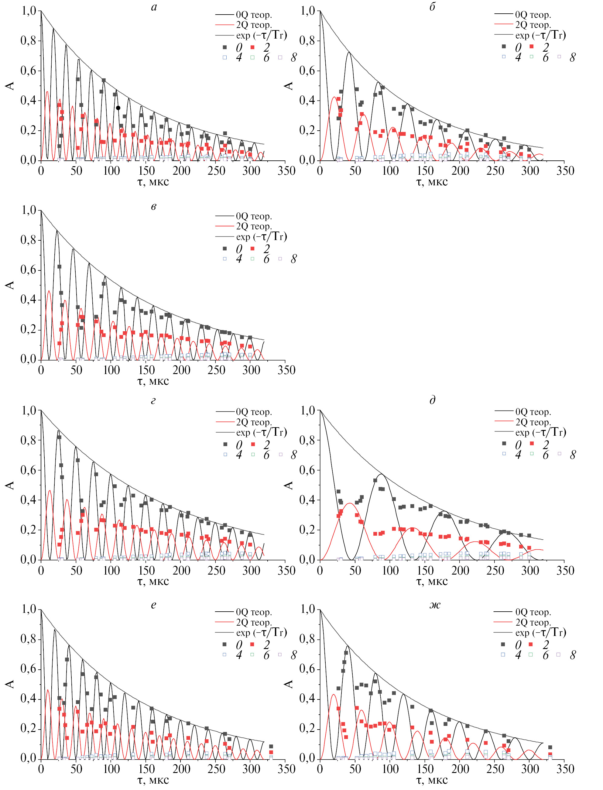 Экспериментальные данные для когерентностей четного порядка представлены на рис. 5 полными символами для когерентностей 0-го и 2-го порядков и пустыми символами для когерентностей более высоких порядков. В экспериментальных данных можно пронаблюдать вплоть до 6 максимумов функции косинус-квадрат для нулевого порядка и соответствующие минимумы для когерентности второго порядка. С увеличением времени подготовки интенсивности когерентностей нулевого и второго порядков уменьшаются, в то время как интенсивности когерентностей более высокого порядка постепенно растут и достигают суммарного значения около 10% для наибольших исследованных времен от начальной интенсивности, наблюдаемой при τ = 0. Появление когерентностей высоких порядков при больших τ указывает на нарушение изолированности спиновых пар. Затухание колебаний интенсивностей когерентностей 0-го и 2-го порядков сопровождается появлением когерентностей более высокого порядка. Осцилляции исчезают примерно при достижении интенсивности когерентности 4-го порядка 5% от общей интенсивности при данном времени τ. Затухание интенсивностей когерентностей 0-го и 2-го порядков происходит по экспоненциальному закону, предсказанному теорией. Это затухание продолжается с тем же характерным значением Tr даже после затухания осцилляций. Теоретические кривые, построенные в соответствии с уравнениями (18) и (19), показаны сплошными линиями на рис. 5 черным и красным цветом соответственно. Также черной сплошной линией показана экспоненциальная огибающая для когерентности нулевого порядка. Теоретические кривые хорошо описывают экспериментальные данные для различных ориентаций.