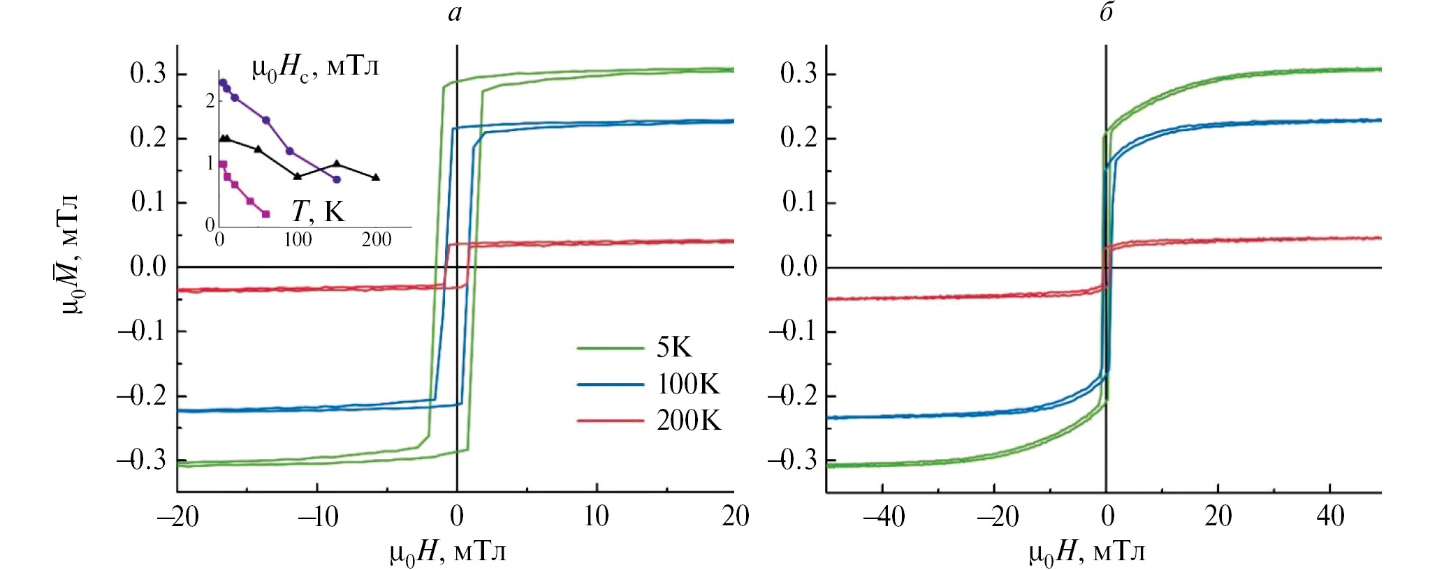 Рис. 1. Петли магнитного гистерезиса для неоднородной пленки Pd-Fe, полученные при различных температурах в магнитном поле, приложенном вдоль направлений [110] (а) и [100] (б). Вставка — зависимость величины коэрцитивного поля (магнитное поле вдоль [110]) от температуры как для неоднородной пленки Pd-Fe (черные треугольники), так и для двух однородных эпитаксиальных пленок с различной концентрацией железа: Pd98Fe2 (розовые квадраты) и Pd92Fe8 (сиреневые кружки).
