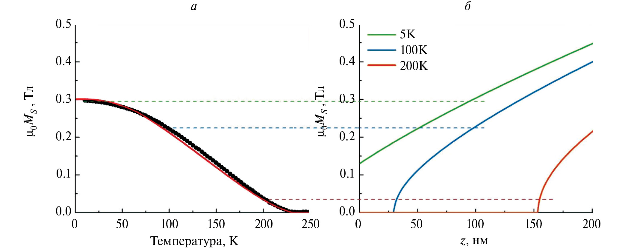 Важнейшим фактором при формировании стоячих спиновых волн в пленке является профиль локальной намагниченности. Для того, чтобы его рассчитать для различных температур (рис. 2б), использовался экспериментальный факт, что характер зависимости удельной намагниченности M/Ms от удельной температуры T/TC является универсальным для однородных эпитаксиальных пленок Pd100−xFex (для 1 < x < 8 %) и описывается формулой Кузьмина [15, 23]. Косвенной проверкой верности расчетов является совпадение рассчитанной из модели средней намагниченности и измеренной экспериментально (рис. 2а). Как видно из рисунка, низко-концентрированная область пленки становится парамагнитной при температуре немного ниже 100 К (рис. 2б). В то же время при температуре 200 К, несмотря на малую среднюю намагниченность пленки Тл, локальная намагниченность у поверхности остается все еще достаточно большой Тл. Полученные расчетные профили намагниченности далее использовались в расчетах спин-волнового резонанса.