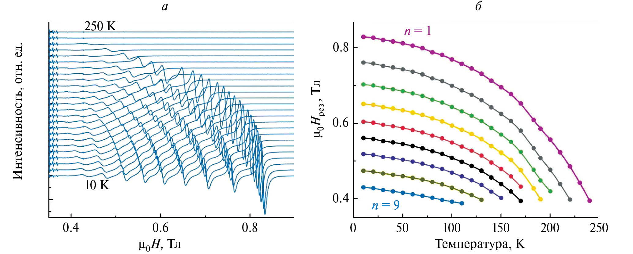 Рис. 3. Температурная зависимость спектра спин-волнового резонанса (а) и величин резонансного поля (б) стоячих спиновых волн в градиентной пленке сплава Pd-Fe. Температура изменяется от 10 до 250 К с шагом 10 К.