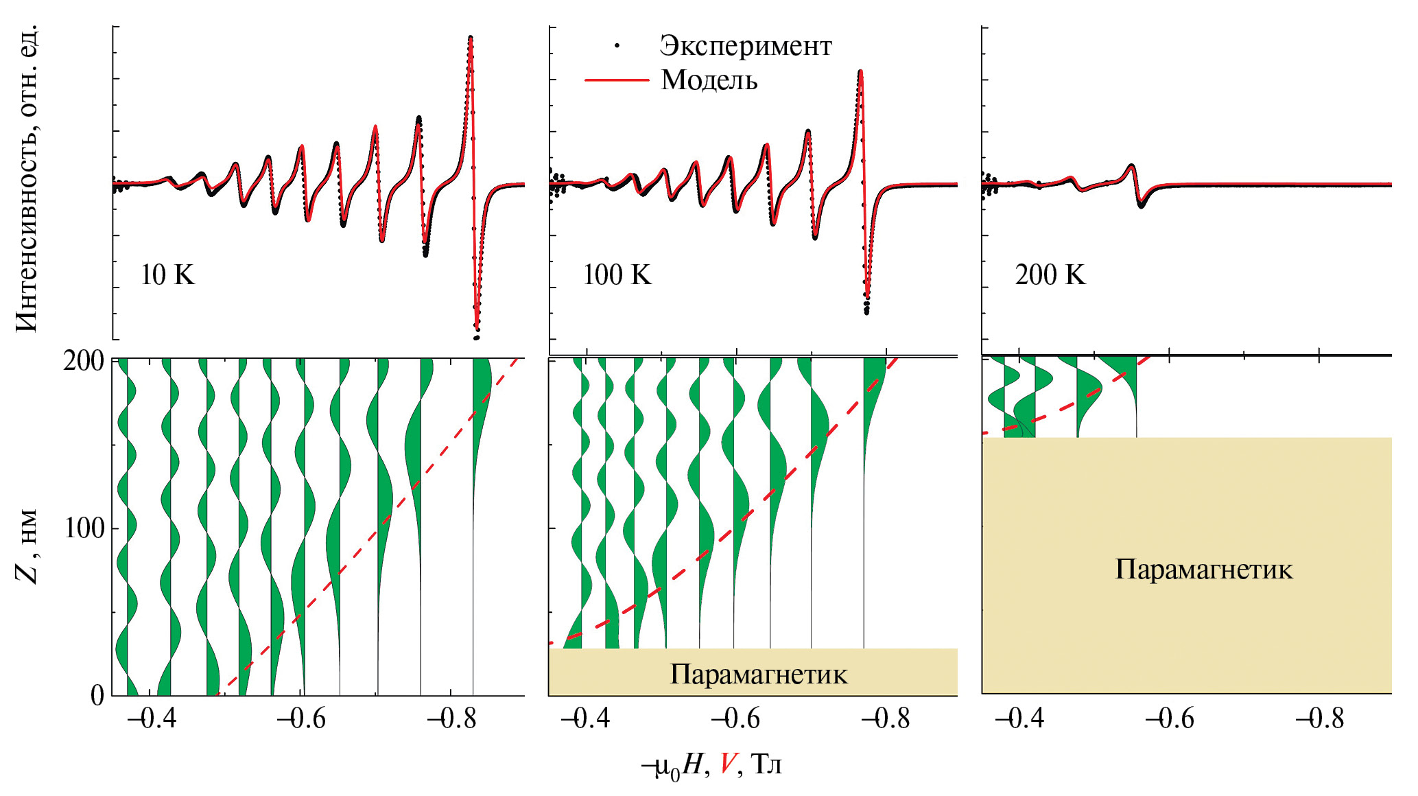 По аналогии с уравнением Шрёдингера V(z) играет роль потенциальной ямы и определяется локальной намагниченностью материала. Тогда в рамках такого подхода находится n-й «энергетический уровень» стоячих спиновых волн в потенциальной яме V(z) (см. рис. 4, красные пунктирные линии). Подробные детали расчета приведены в работах [12, 18]. Для каждой температуры подбирались параметры . Примеры результатов расчета спектров СВР показаны на рисунке 4. Как видно, модельные спектры показывают хорошее совпадение с экспериментальными данными.