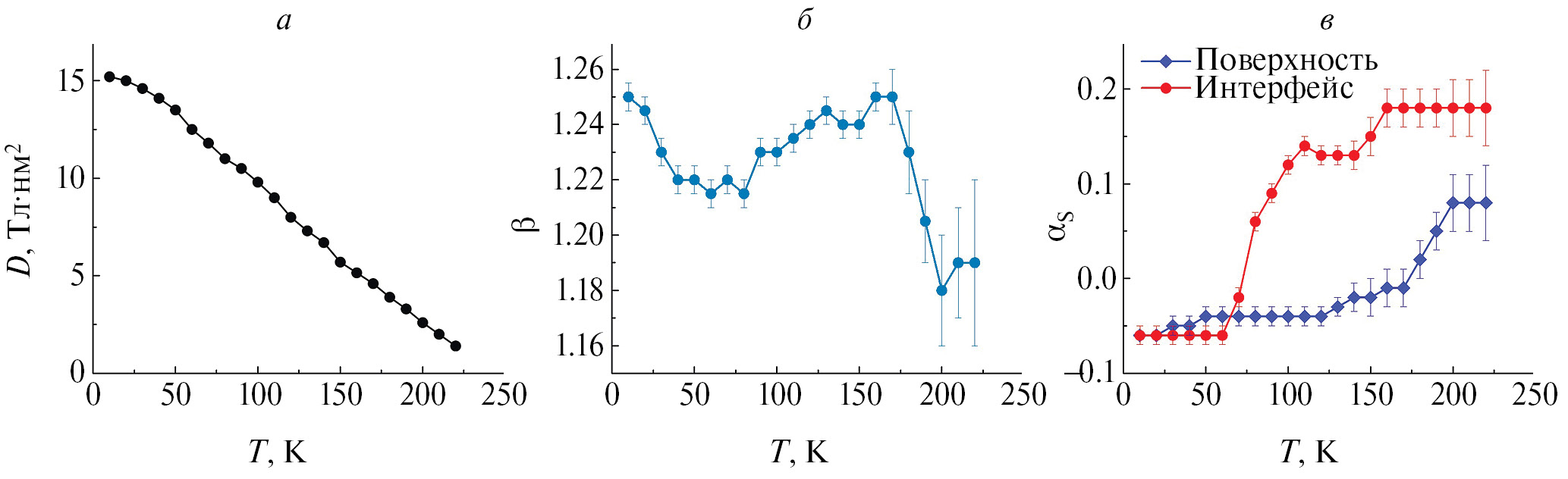 Полученные температурные зависимости параметров показаны на рисунке 5. Как видно из рисунка, нормированный коэффициент обменной жесткости практически линейно уменьшается до 0 с ростом температуры (рис. 5а). Параметр β больше 1 и слабо изменялся с температурой (рис. 5б). Это также подтверждается измерением петель магнитного гистерезиса (не показаны в данной работе) в магнитном поле, приложенном вдоль нормали к пленке. Коэффициенты поверхностного пиннинга для поверхности и интерфейса имеют малые значения (слабый пинниг), однако проявляют существенно разные температурные зависимости (рис. 5в). Пиннинг на поверхности слабо изменяется во всем диапазоне температур. В противоположность этому, при низких температурах примерно совпадает с , а при температуре около 70—80 К испытывает резкий скачок (рис. 5в), что связано с появлением парамагнитной фазы вблизи поверхности подложки. На интерфейсе ферромагнетик/парамагнетик пиннинг спинов оказывается бóльшим по величине, чем на поверхности. Это согласуется с выводом о дополнительном пиннинге доменных стенок на границе ферромагнетик/парамагнетик, который был сделан выше по результатам измерения зависимости величины коэрцитивного поля от температуры.