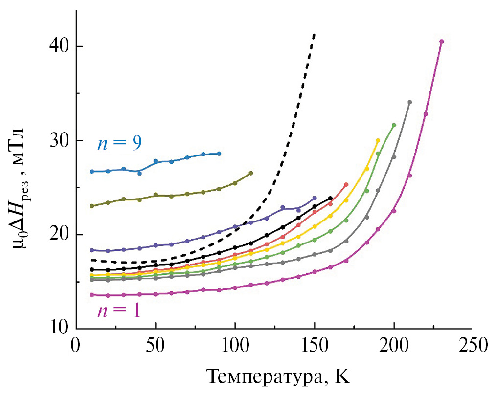 Зависимость ширины линии резонансов стоячих спиновых волн от температуры приведена на рис. 6. Для сравнения также показана зависимость ширины резонанса для однородной пленки Pd94Fe6 с температурой Кюри 175 К (пунктирная кривая). Как видно из рисунка, ширина резонанса моды n = 1 имеет схожую температурную зависимость с таковой в однородном образце. А ширина резонанса моды n = 9 практически не зависит от температуры. Подробное исследование данных особенностей находится за пределами интересов данной работы.