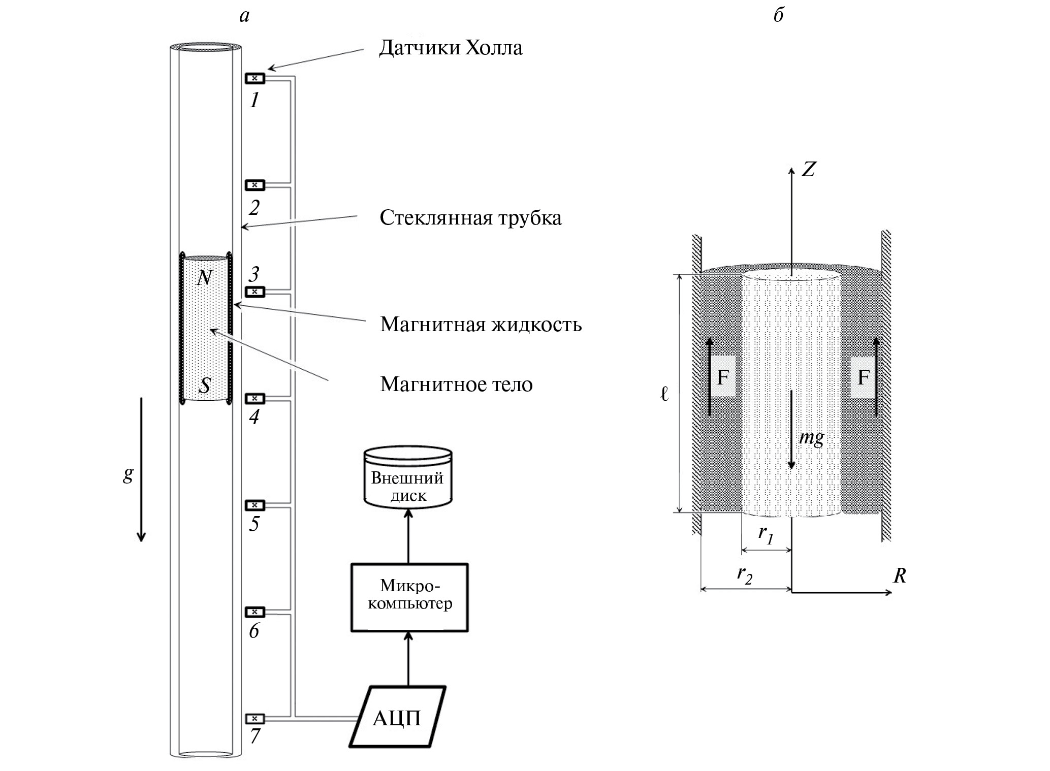 Рис. 1. Схема экспериментальной установки (а). Заполненный МЖ коаксиальный зазор между магнитом и трубкой с указанием направления основных сил (б).