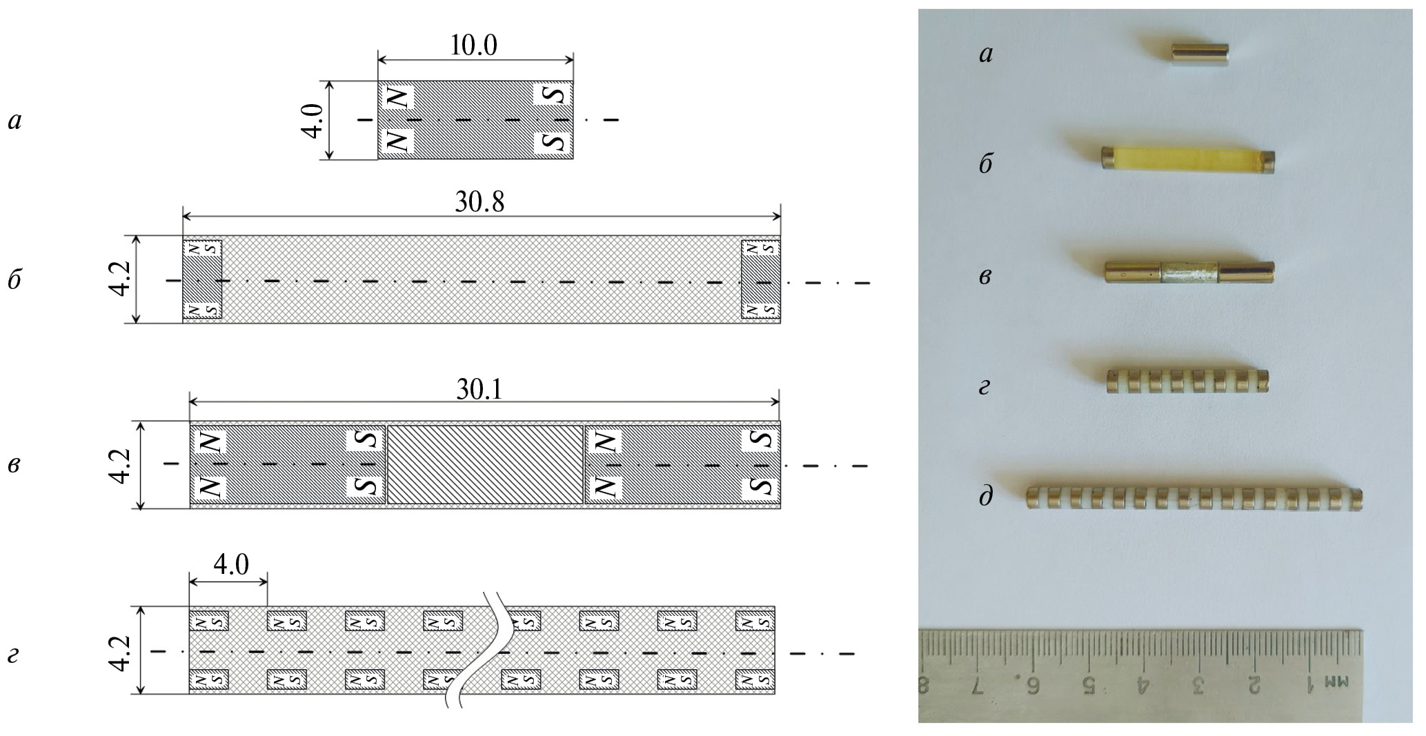 Лабораторные опыты проводились на экспериментальной установке, устройство которой поясняется принципиальной схемой на рис. 1а. Вертикальная стеклянная трубка длиной L = 138 см и внутренним радиусом r2 = 2.24 мм была зафиксирована креплениями из немагнитного и неэлектропроводного материала (ABS-пластик). В качестве инертной массы использовали магнитные тела цилиндрической формы с направлением магнитного момента вдоль оси цилиндра. Были выбраны тела нескольких конструкций (см. рис. 2): одиночный цилиндрический постоянный магнит (а); два магнита с немагнитным стержнем между ними (б, в); сборки из нескольких (8—16 штук) кольцевых магнитов с прослойками из немагнитного материала (г). Магнитные сборки были изготовлены в калиброванных формах с применением эпоксидной смолы, что позволило одновременно достичь механической прочности и точности изготовления тела заданного размера (отклонения от идеальной цилиндрической поверхности не превышали 0.05 мм при диаметре тела 2r1 = 4.20 мм).