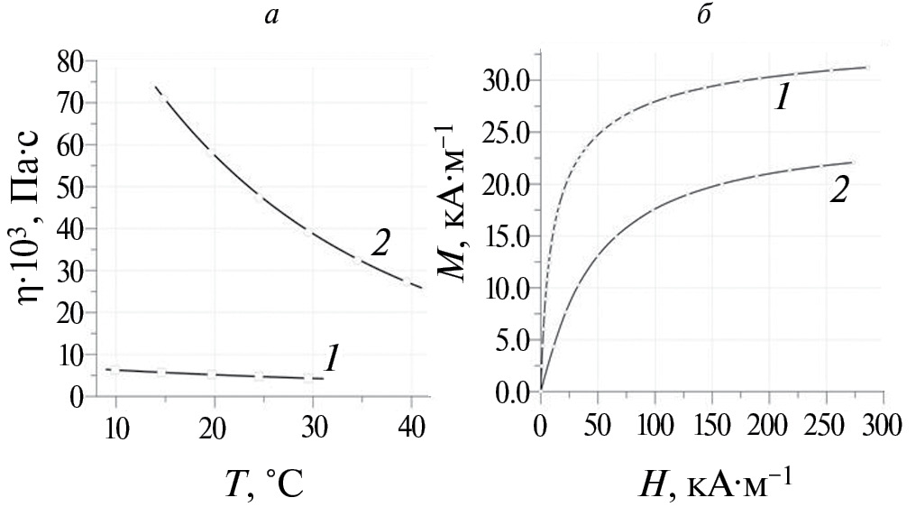 При проведении опытов использовали МЖ вида «магнетит — олеиновая кислота — жидкие углеводороды» на основе керосина (образец 1) и трансформаторного масла (образец 2). Плотность МЖ ρ измеряли пикнометром, а динамическая вязкость η — ротационным вискозиметром Брукфильда в интервале температур T = +15…+30 °C (рис. 3а). Кривую намагниченности M(H) образцов МЖ (рис. 3б) измеряли методом дифференциальной прогонки [31]. Средний магнитный момент частиц ⟨μ⟩ и их числовую концентрацию n определяли методом магнитогранулометрического анализа кривых M(H) [32] (табл. 1). Плотность обеих МЖ отличалась незначительно, а их вязкость отличалась на порядок.