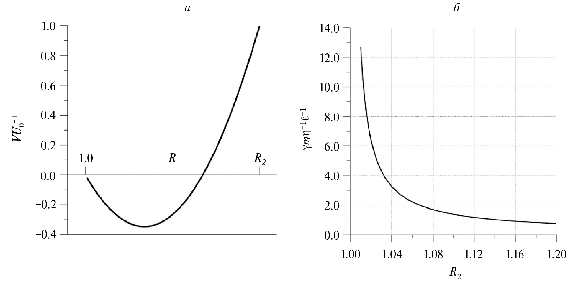 Рис. 5. Профиль скорости течения МЖ в коаксиальном зазоре (а) и зависимость коэффициента трения (в единицах ηℓ / m) от отношения радиусов стенок коаксиального зазора R2 = r2 / r1 (б).