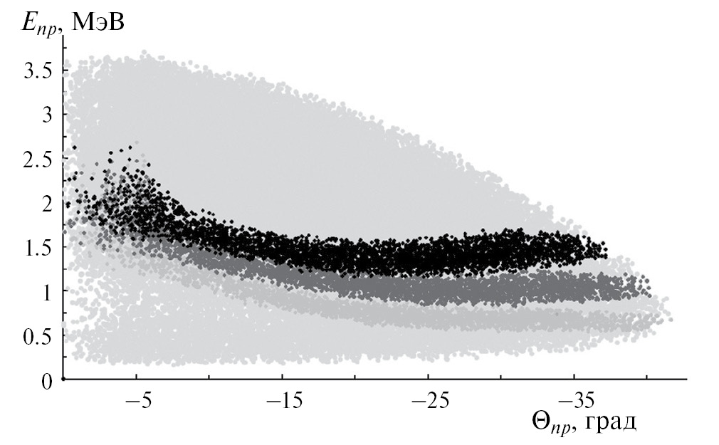В результате работы программы рассчитываются углы вылета и кинетические энергии (Θn1 и En1) нейтрона отдачи и центра масс np-пары (Θnp и Enp) в лабораторной системе (л. с. к.). Так, на рис. 1 можно видеть результат моделирования реакции n + 2H → (np) + n1 в виде двумерной диаграммы Enp — Θnp (светло-серые точки), а также кинематические области для трех различных углов регистрации нейтрона отдачи Θn1: 25°±2.5° (серые точки), 35°±2.5° (темно-серые точки) и 45°±2.5° (черные точки).