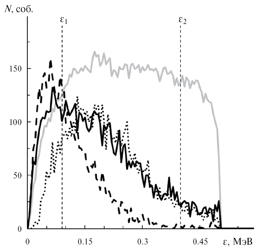 Рис. 2. Сравнение моделированных зависимостей выхода реакции nd-развала от ε при следующих параметрах моделирования: E0 = 5±1 МэВ, ε0 = 0.04 МэВ, Θn1 = 45°±2.5° и различных значений Θn2: –20°±50° (серая кривая), —37°±2.5° (черная сплошная кривая), —25°±2.5° (черная пунктирная кривая) и –10°±2.5° (черная точечная кривая). Штриховыми прямыми показаны границы суммирования событий для вычисления величины SF: ε1 = 0.09 МэВ, ε2 = 0.4 МэВ.