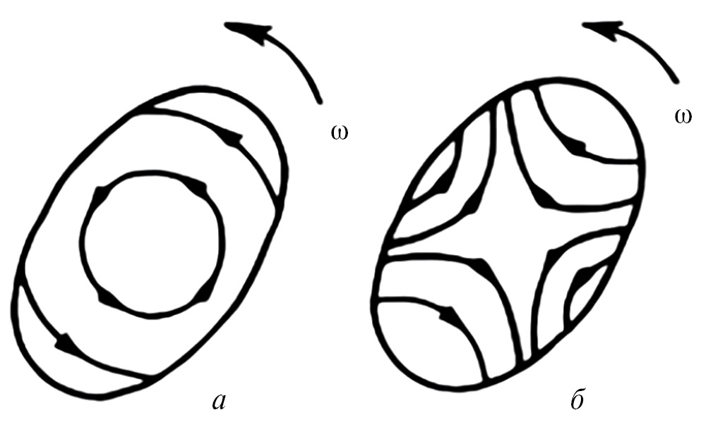 Рис. 1. Поле скоростей при вращении твердого тела (а) и при потенциальном движении идеальной жидкости во вращающейся жесткой оболочке (б).