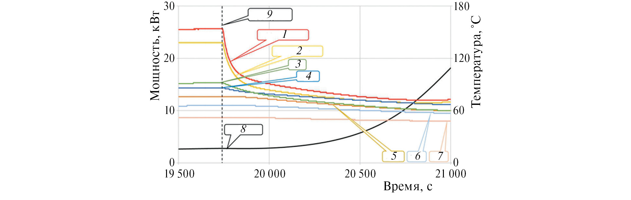 Рис. 3 Временная диаграмма показаний термопар при включении охлаждения. 1 — термопара (ТП) на НБ-1П верх; 2 — ТП на НБ-1П низ; 3 — ТП на АБ; 4 — ТП на НБ-1Л; 5 — ТП на НБ-1П; 6 — ТП на НБ-2; 7 — ТП на ПБ; 8 — мощность; 9 — включение охлаждения.