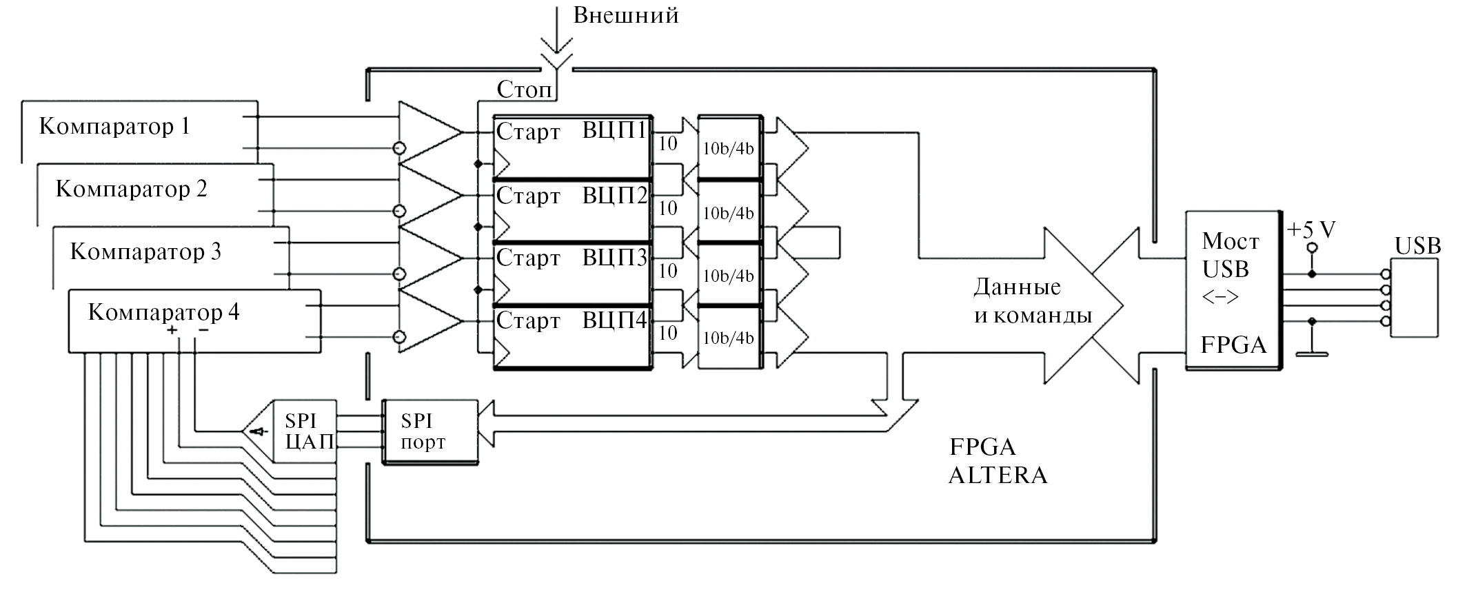Блок-схема быстрой электроники и схема четырех каналов регистрации представлена на рис. 3. Основная часть логических блоков преобразователей реализована в составе FPGA. Внешними по отношению к кристаллу FPGA являются компараторы и многоканальный ЦАП, задающий пороги компараторов. Поскольку компараторы включены в дифференциальной моде, для каждого устанавливаются два опорных напряжения.
