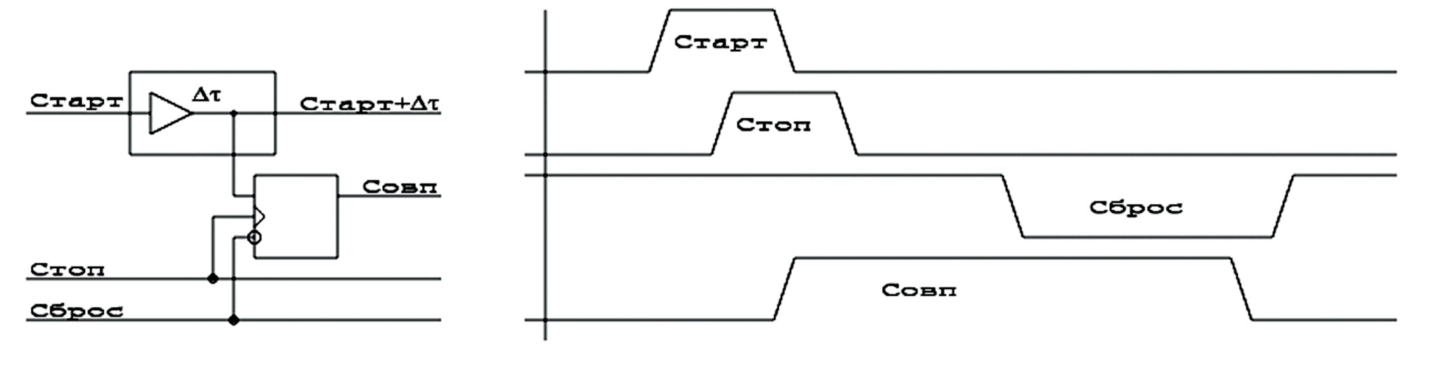Более подробно один из элементов, на котором построен преобразователь время—код представлен на рис. 5, временная диаграмма, поясняющая особенности работы этой системы представлена справа.