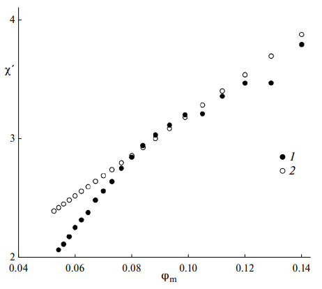 Значение коэффициента Aω, рассчитанное для частоты 320 Гц, с использованием оценок значений τ близко к единице. Это позволяет провести сопоставление экспериментальных результатов измерения восприимчивости магнитной жидкости при добавлении немагнитного наполнителя в теоретическими зависимостями, определяемыми выражениями (2) и (3).