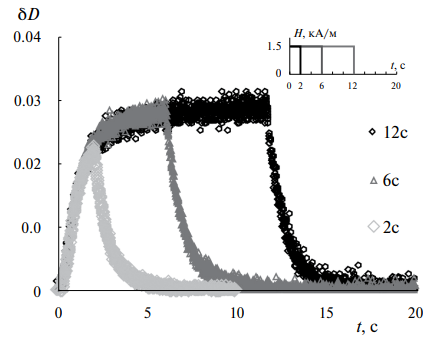 На рис. 1 представлена кривая зависимости изменения прозрачности образца под действием импульсов магнитного поля длительностью t = 2, 6 и 12 с, направленного параллельно лучу падающего света. Из этого графика следует, что при воздействии магнитного поля прозрачность образцов эмульсии уменьшается, а после выключения поля происходит процесс релаксации с восстановлением первоначальной прозрачности. Таким образом, в данном случае параметр магнитооптического эффекта δD положителен. На вкладке рис. 1 изображена форма импульса магнитного поля. Эксперимент показал, что изменение длительности импульса от 2 до 12 с не приводит к принципиальным изменениям формы магнитооптического отклика. При длительности импульса более 5 с эффект приходит в состояние насыщения и его максимальная величина в дальнейшем не изменяется. Также длительность действия поля практически не влияет на характерное время релаксации оптического эффекта t (уменьшение значения эффекта в e раз), которое составляет около 1 с. Из этого можно сделать вывод о том, что характерный размер капель эмульсии и их концентрация не меняются при длительностях действия поля до 12 с.