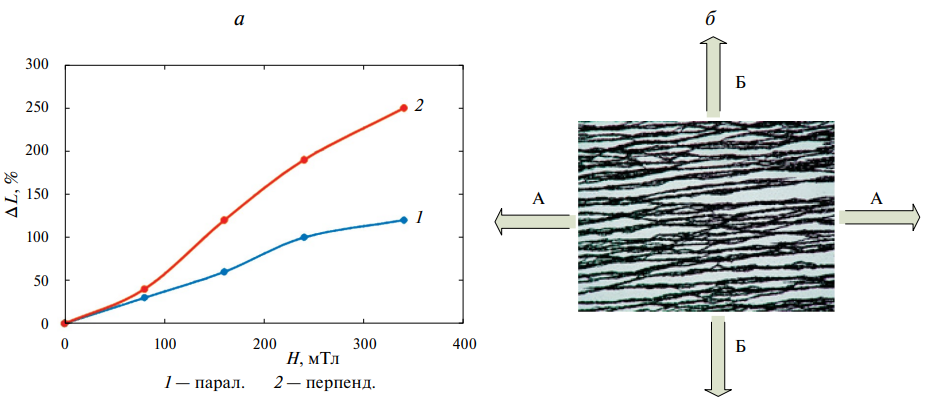 Одним из основных свойств МАЭ является магнитодеформационный эффект — деформация в неоднородном магнитном поле. Мы исследовали деформацию анизотропного МАЭ с магнитомягким наполнителем — карбонильное железо в количестве 75 % масс или 25 % об. Анизотропные образцы получали полимеризацией жидкой композиции в магнитном поле. Далее из пластины вырезали полоски с ориентацией вдоль поля полимеризации или перпендикулярно полю. При полимеризации в магнитном поле в образце возникали цепеобразные структуры из частиц магнитного наполнителя, вытянутые вдоль линий магнитного поля. Такие структуры для разбавленной композиции в тонком слое показаны на рис. 1б. При механическом растяжении материал показывает разную упругость в зависимости от направления деформации. Ранее такие исследования были проведены для различных типов наполнителей [13]. В данном исследовании смотрели растяжение в неоднородном магнитном поле. Образец длиной 2 см подвешивался над электромагнитом, на поверхности которого измеряли магнитное поле. В таком неоднородном магнитном поле образец вытягивался в направлении одного полюса электромагнита. Эксперимент проведен для анизотропного образца в зависимости от ориентации структуры образца относительно полюса электромагнита. Величина деформации в зависимости от магнитного поля на полюсе электромагнита представлена на рис. 1а.