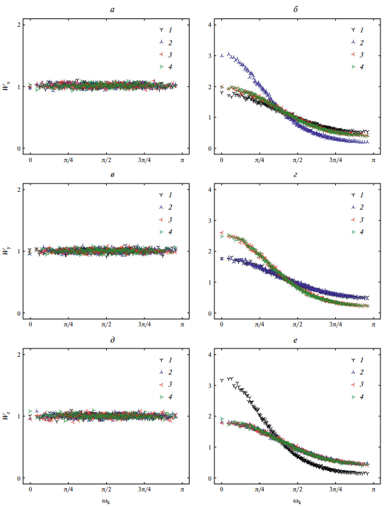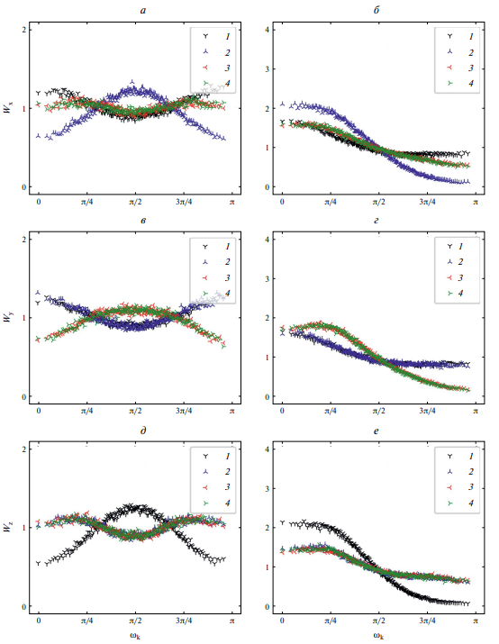 Рис. 3. Зависимость одночастичной плотности вероятности W от угла ωk для модельной МГЧ с ребром A = 1 и λe = 3: (а) , α = 0; (б) , α = 1; (в) , α = 0; (г) , α = 1; (д) , α = 0; (е) , α = 1. Символами обозначены результаты моделирования Монте—Карло. Номер символа соответствует номеру гранулы в модельной МГЧ.