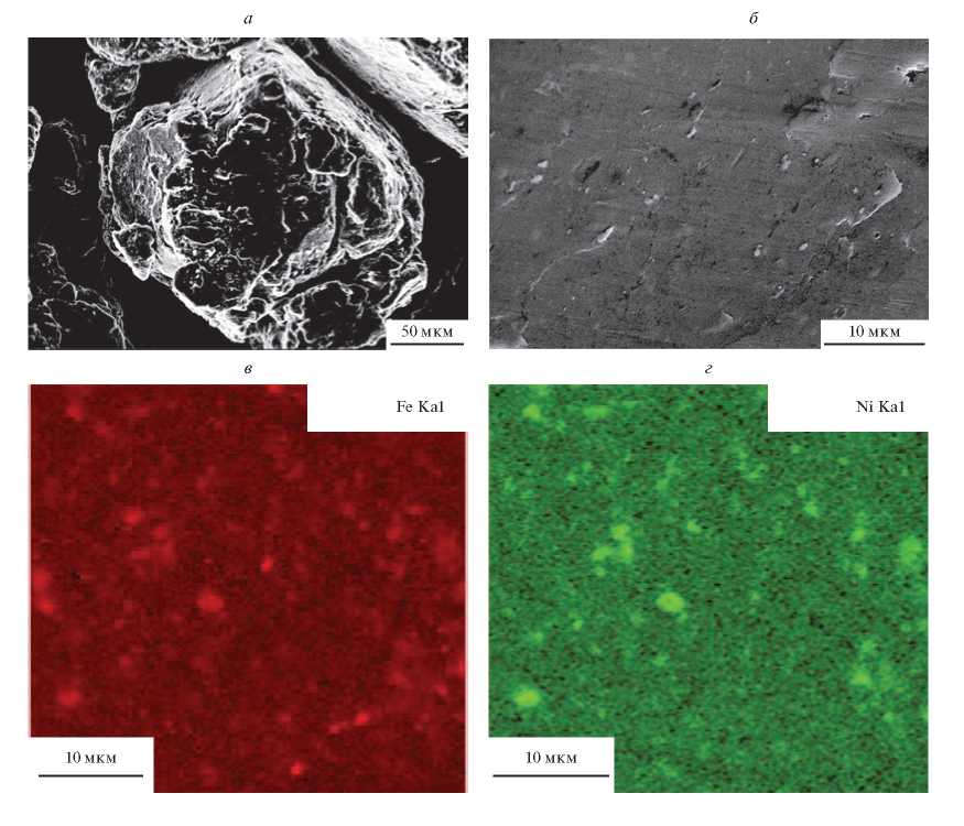 На рис. 3 показаны частицы порошка из опытной партии, предназначенной для плазменной обработки. Как видно, частицы имеют компактную осколочную форму с развитой поверхностью (рис. 3а). На фоне алюминиевой матрицы видны дисперсные частицы интерметаллидов (рис. 3б), которые по данным энергодисперсионного анализа содержат никель и железо (рис. 2в и 2г). Учитывая результаты исследования структуры никалина подробно описанные в работе [19], можно считать, что это дисперсные эвтектические алюминиды Al9FeNi, измельченные в процессе интенсивной пластической деформации при помоле. Их размеры составляют менее 2 мкм, что в 30 раз меньше размеров алюминидов, формирующихся в литом сплаве никалин такого же состава [19].