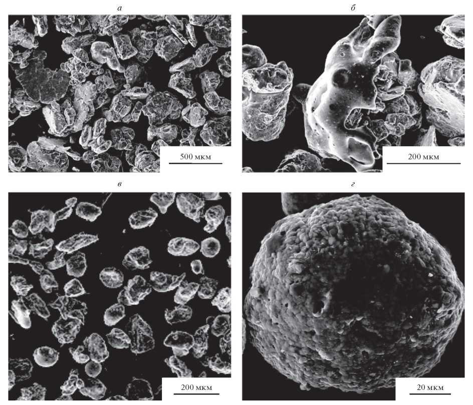 Вторая партия порошка получена в эксперименте с плазмообразующей смесью воздуха и пропана и такими же техническими характеристиками. В процессе такой плазменной обработки формируются частицы неправильной формы с гладкой поверхностью (рис. 4в). Удалось достичь частичной сфероидизации частиц порошка (рис. 4г), доля сферических частиц составляет 12%. Плазменная обработка практически не изменила размерные характеристики частиц порошка (табл. 2) и их гранулометрический состав.
