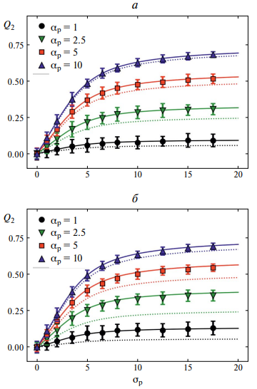 Вполне очевидно, что формирование текстуры существенно зависит от энергии магнитной анизотропии. Этот эффект продемонстрирован на рис. 2, где представлены зависимости второго момента Q2 ориентационного распределения (11) от параметра σp для тех же значений поля полимеризации, что и на рис. 1. Второй момент представляет собой возрастающую функцию σp, поскольку физической причиной разворота не только магнитного момента в поле, но и разворота самой частицы, является энергетическое взаимодействие (1) между магнитным моментом и осью легкого намагничивания, стремящееся выстроить легкую ось и магнитный момент вдоль друг друга. При этом для слабого поля полимеризации заметного текстурирования не наблюдается даже для очень высоких энергий анизотропии (черные кривые). Интересно отметить, что степень параллельности легких осей достаточно далека от предельного значения «единица» даже для высоких значений σp ~ 20 и поля полимеризации αp = 10 и составляет всего 0.7. Межчастичное взаимодействие усиливает воздействие внешнего поля, это видно из сравнения рис. 2а и 2б, при этом наибольший относительный эффект от влияния взаимодействия наблюдается в слабых полях, а в сильных полях поправка, вызванная взаимодействием, оказывается мало существенной. Это вполне понятно, поскольку энергия взаимодействия отдельного магнитного момента и интенсивного магнитного поля намного превосходит характерную энергию межчастичного магнито-дипольного взаимодействия.