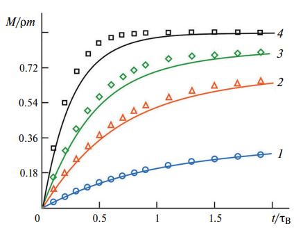 переходящее в выражение (7) в пределе малых времен (t ≤ τB). Однако следует отметить, что выражение (19), строго говоря, справедливо только на самом начальном участке зависимости намагниченности от времени и на конечном участке приближения к равновесному значению. В обоих случаях процесс роста намагниченности контролируется двумя параметрами: характерное время процесса прямо пропорционально времени броуновского вращения одиночной частицы τB, но также оно зависит от интенсивности приложенного магнитного поля, которое является «движущей силой» процесса намагничивания. Усиление поля приводит к более быстрому росту намагниченности, особенно ярко это проявляется на начальном этапе, где начальный угол наклона кривой M(t) прямо пропорционален напряженности намагничивающего поля (7).