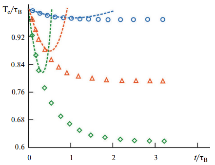 Рис. 3. Временная зависимость τe(t)/Te, рассчитанная численно согласно выражению (21), для различных значений напряженности приложенного магнитного поля, выраженного в единицах параметра Ланжевена: α = 1 (синие круги), α = 3 (красные треугольники), α = 5 (зеленые ромбы). Пунктирными кривыми обозначены предсказания асимптотики малых времен (10). Начиная с характерных времен t ~ 3τB, эффективное время τe (t) начинает расти, достигая асимптотически значения Te (19) в пределе t → ∞. Этот предел не может быть корректно рассчитан численно при использовании конечного числа уравнений системы (4).