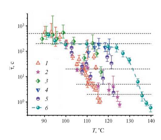 Рис. 2. Среднее время жизни перегретого н-пентана в зависимости от температуры при атмосферном давлении: 1–5 – эксперимент; 6 – данные [24], D = 7 мм, V0 = 2.7 ∙ 10–6 м3; 1–2 – термостатирована верхняя часть трубки 1, D = 5.6 мм, V0 = 2.8 ∙ 106 м3 [7–10, 12]; 3–5 – середина трубки 2, D = 5.6 мм, V0 = 2.6 ∙ 106 м3.