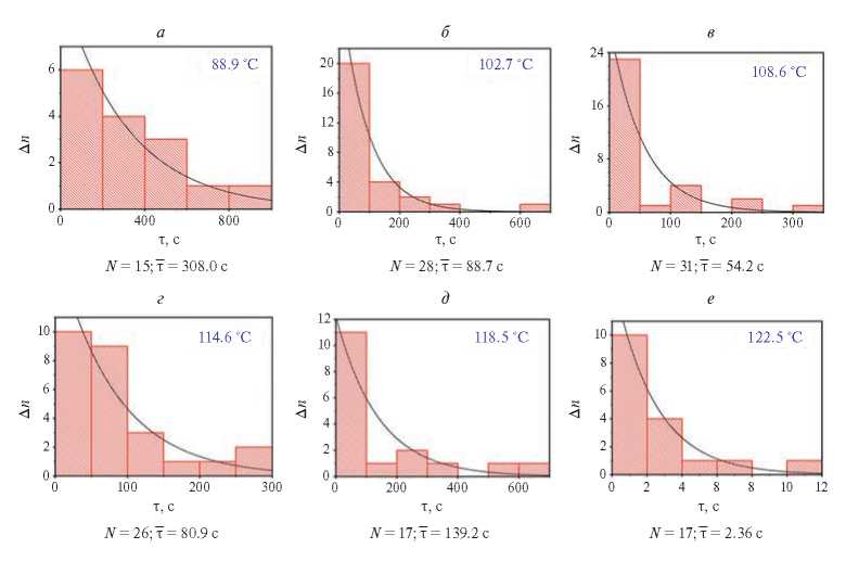 На рис. 3 представлены типичные гистограммы распределения времен жизни перегретого н-пентана в стеклянной трубке, полученные при атмосферном давлении и разных температурах, а также экспоненциальное распределение случайной величины τ. В ряде случаев (см. рис. 3б, в, д) наблюдается заметное отклонение от показательного распределения τ за счет преобладающего вскипания при малых временах жизни перегретого состояния. Подобные распределения хорошо описываются смесью экспоненциальных и нормальных распределений [8], что свидетельствует о действии нескольких конкурирующих механизмов парообразования.