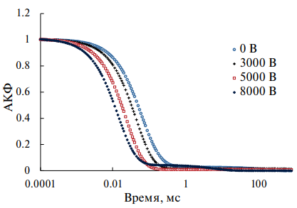 На рис. 1 представлены АКФ рассеянного света в магнитной жидкости под действием электрического поля небольшой напряженности (0.3 МВ/м) и в отсутствие поля. Анализ автокорреляционных функций показывает, что поля подобной величины способствуют росту агрегатов, размер которых может достигать 1—10 мкм. При этом интенсивность рассеянного магнитной жидкостью света возрастает. Изменение интенсивности рассеянного света может быть очень значительным и достигать 5—8 раз в полях до 0.5—0.7 МВ/м особенно в свежеразбавленных магнитных жидкостях, не подвергавшихся ранее воздействию электрического поля. Формы АКФ существенно меняются при повышении напряжения между электродами. На рис. 2 представлены автокорреляционные функции для различных напряжений при межэлектродном расстоянии 2 мм. Видно, что характерное время спада функции уменьшается примерно на порядок при увеличении напряжения до 3 кВ. Классическая интерпретация таких функций приводит к выводу об уменьшении характерного размера частиц до 1 нм и менее. Физически это представляется невероятным. Однако такой же эффект значительного уменьшения постоянной времени автокорреляционной функции можно объяснить и с других позиций. Уменьшение постоянной времени может быть связано с тем, что частицы магнитной жидкости помимо броуновского движения участвуют еще в одном достаточно быстром движении, также имеющем хаотический характер. Таким движением может быть электроконвекция, возникающая в жидких диэлектриках при достаточно высоких напряжениях между электродами.
