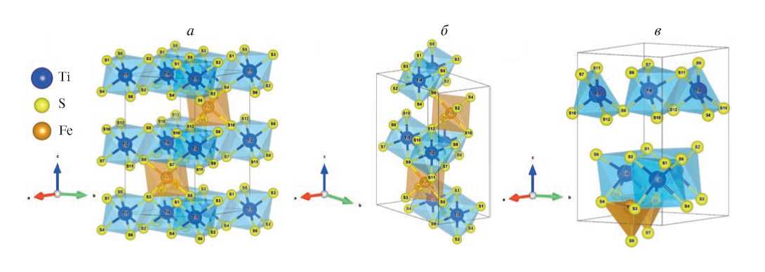 На рис. 1 представлены кристаллические структуры системы Fe0.33TiS2, полученные в данной работе. Рис. 1а – SDFT-структура, расчеты которой проводились с использованием только пакета VASP. Рис. 1б – SDFTML-структура, которая получена с использованием машинного обучения, реализованный в программном комплексе USPEX в виде эволюционного алгоритма по поиску наиболее стабильной структуры. У полученной структуры можно наблюдать сохранение октаэдральной формы соединений TiS2 и FeS2. Основным отличием структур рис. 1а, б является изменение кристаллографического угла β = 120o по сравнению исходным значением β = 90o. Существование такой структуры экспериментально подтверждено в работе [22].