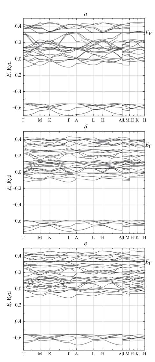 Рис. 2. Зонная структура парамагнитного TiS2 (а); парамагнитного Fe0.33TiS2 (б) и ферромагнитного Fe0.33TiS2 (в).