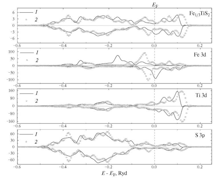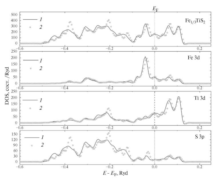 На рис. 3 представлены плотности состояний парамагнитных систем Fe0.33TiS2. Видно, что наибольший вклад от Fe, в обоих случаях, достигается в области [–0.1; 0.0] Ryd, достаточно сильная гибридизация наблюдается у атомов Ti в интервале [0.0; 0.15] Ryd. Значительное отличие между эти структурами, в парамагнитном состоянии, наблюдается для атомов серы – пики 3p-состояний в области [–0.4; 0] у SDFTML значительно выше, чем у SDFT. В работе [16], представлены результаты фотоэмиссионного спектра для интеркалата Fe1/3TiS2, которые показывают наличие пиков при примерных значениях энергии 0.5 эВ (0.037 Ryd) и 4 эВ (0.3 Ryd). Для полученных нами значений DOS для железа, представленные на рис. 3 пики наблюдаются при этих же значениях энергии (0.035 Ryd и 0.3 Ryd).