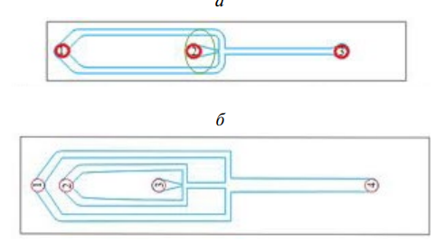 Рис. 2. Конфигурация микрофлюидных устройств: чип для одиночных эмульсий (а): 1 — коннектор для подачи непрерывной фазы, 2 — коннектор для подачи дисперсной фазы, 3 — выходной коннектор; чип для двойных эмульсий (б): 1 — коннектор для подачи внешней фазы. Зеленым цветом выделена область магнитной левитации при нулевом положении кольцевого магнита, 2 — коннектор для подачи средней фазы, 3 — коннектор для подачи внутренней фазы, 4 — выходной коннектор.