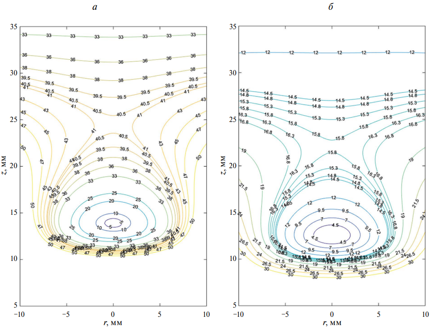 В проведенных исследованиях использовались два кольцевых постоянных неодимовых магнита с различной геометрией (Магнит1: внешний диаметр — 60 мм, внутренний диаметр — 24 мм и высота — 10 мм, максимальное значение напряженности магнитного поля 214 кА/м и Магнит2: внешний диаметр — 50 мм внутренний диаметр — 25 мм и высота — 5 мм, максимальное значение напряженности магнитного поля 85 кА/м). Моделирование области «магнитного вакуума» для используемых кольцевых магнитов изображено на рис. 3.