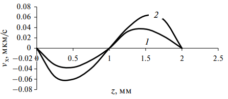 Рис. 4. Продольная компонента скорости νx в зависимости от координаты z для различных времен t при фиксированном x = x0/2 и ω = 10 c−1. Кривая 1: t = 1 c; кривая 2: t = 0.5 c . Остальные параметры такие же, как и на рис. 2.