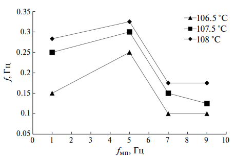 Чтобы отобразить данную немонотонность выбирались 3 значения температур поверхности нагревателя из интервала уверенной регистрации (106.5—108.5 °C), при которых по данным рис. 5 были построены зависимости частоты образования пузырьков пара f от частоты внешнего приложенного магнитного поля fмп. Эти зависимости представлены на рис. 6. Различные кривые соответствуют температурам поверхности нагревателя 106.5, 107.5 и 108.2 °C. Из рис. 6 видно, что при увеличении частоты внешнего переменного магнитного поля от 1 до 5 Гц во всем представленном интервале температур поверхности нагревателя частота образования пузырьков пара возрастает. При дальнейшем повышении частоты внешнего переменного магнитного поля от 5 до 7 Гц частота парообразования уменьшается. При увеличении частоты внешнего переменного магнитного поля от 7 до 9 Гц во всем представленном интервале температур поверхности нагревателя частота образования пузырьков пара не изменяется более чем в пределах погрешностей измерения.