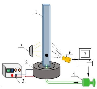 Плоский стеклянный канал 1 (толщина 2 мм), установлен вертикально с помощью системы немагнитных крепежных элементов и заполняется глицерином. В качестве источника неоднородного магнитного поля используется соленоид 2, который расположен соосно оси канала и подключен к источнику питания 3, который необходим для изменения напряженности магнитного поля. Для подачи магнитной жидкости снизу подведена трубка шприцевого насоса 4. В качестве источника света используется управляемый светодиодный осветитель 5. Видеофиксация динамики всплывающих капель магнитной жидкости в глицерине при воздействии на нее магнитного поля разной напряженности осуществляется в проходящем свете с помощью высокоскоростной камеры (Nikon 1) 6, подключенной к компьютеру 7. Обработка изображений и расчет коэффициента удлинения магнитного включения осуществляется с помощью программы Digimizer.
