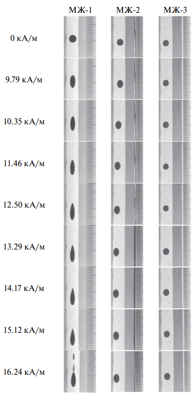 В результате эксперимента были получены данные эволюции формы капли МЖ, всплывающей в стеклянном плоском канале, заполненном глицерином, под действием магнитного поля различной напряженности, показанные на рис. 3.