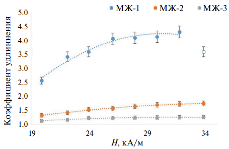 С помощью программной среды Digimizer получены зависимости коэффициента удлинения капли МЖ от параметров используемых магнитных жидкостей и значения напряженности магнитного поля, представленные на рис. 4.