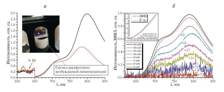 Рис. 5. Сигналы второй оптической гармоники и двухфотонно возбуждаемой люминесценции в микрокристаллическом порошке красителя DAQT при облучении фемтосекундными импульсами на длине волны 1250 нм для двух положений кюветы с порошком при ее перемещении перпендикулярно направлению луча накачки (а), (изображение образца в установке на врезке); спектры двухфотонного возбуждения люминесценции при разной средней мощности фемтосекундного излучения на длине волны 1250 нм (б) (на врезке приведена зависимость интенсивности двухфотонно возбуждаемой люминесценции от средней мощности излучения фемтосекундных импульсов возбуждения и ее экстраполяция параболической функцией).