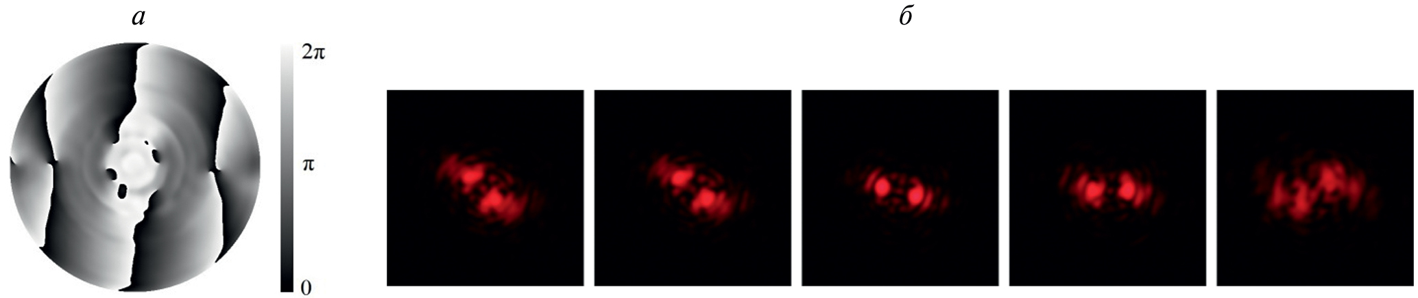Рис. 1. Фазовая функция ДОЭ, оптимизированного для работы в трехмерном наноскопе (а). Распределения интенсивности, формируемые ДОЭ, изготовленным методом прямой лазерной записи по фоторезисту на различных расстояниях около плоскости фокусировки линзы с F = 250 мм (б). Размер стороны кадра 2 мм.