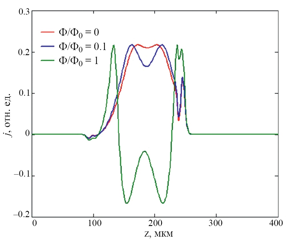 Численное моделирование временной эволюции плотности тока в среде фотонного кристалла на основе примесных УНТ в отсутствии и присутствии внешнего магнитного поля проводилось с помощью прямой конечно-разностной схемы типа «крест» [20], в которой выполняется условие Куранта. Точность решения превышает 0.01 %. При численном моделировании исследуемой системы, ее параметры выбирались следующим образом: = 13, T = 293 K [21], время релаксации в УНТ ≈ 10-11 c, длительность импульса ≈ 10-14 c, ширина импульса вдоль осей координат: — скорость входа ПКИ в среду фотонного кристалла. Параметры модуляции показателя преломления фотонного кристалла задавались следующим образом: глубина модуляции = 0.25, период модуляции = 2.5 мкм.