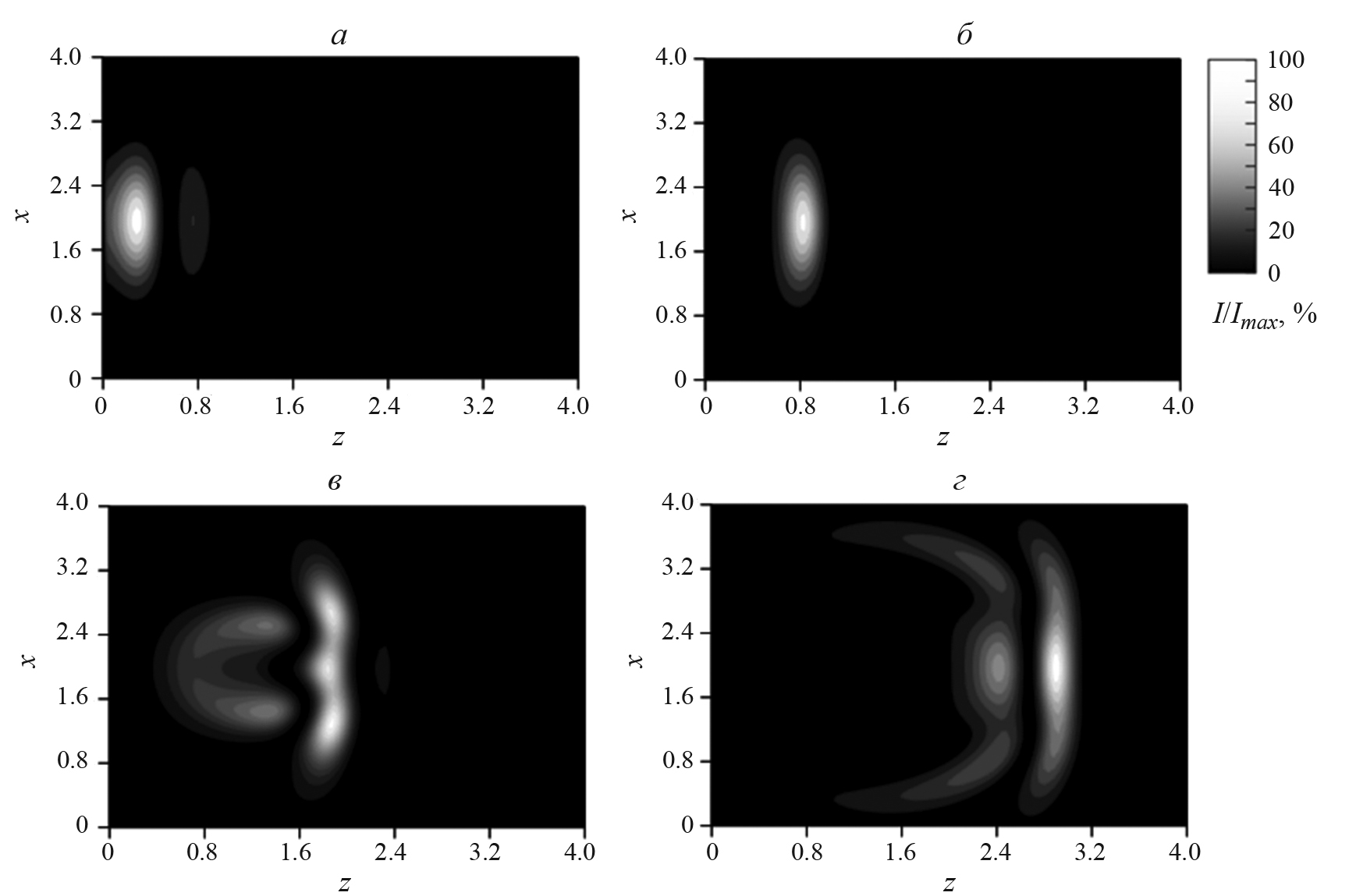 Рис. 1. Зависимость интенсивности электрического поля 3D импульса от координат в различные моменты времени z: t = 0 (а), 1.5 (б), 2.5 (в), 3.5 (г). Значения по цветовой шкале нормированы на максимальное значение I в каждый момент времени. Координаты места расположения неоднородности — x = 2.0, z = 1.2.