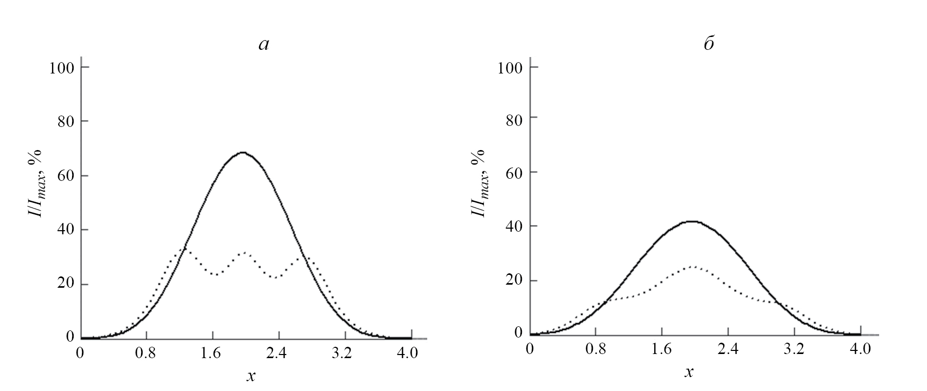 Рис. 2. Поперечные срезы интенсивности электрического поля 3D импульса, проходящие через максимум импульса, от координаты x: t = 2.5 (а), 3.5 (б). Сплошная кривая соответствует массиву УНТ без металлической проволоки, точечная — массив УНТ с неоднородностью.